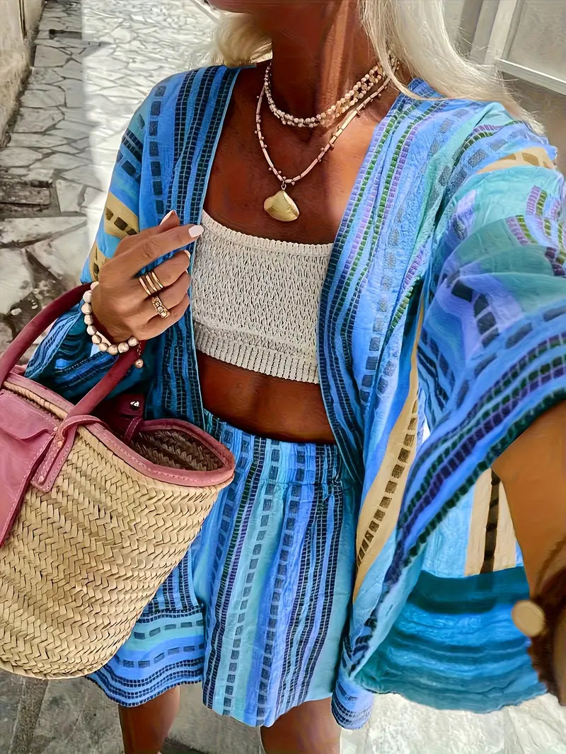 This elegant two-piece set for women features a loose-fitting cropped top paired with matching shorts and a coordinating cardigan, ideal for summer outings and casual wear. Crafted from 100% polyester with a classic blue and white striped woven design, it offers a comfortable fit without elasticity. The set is machine washable and designed with random printing, ensuring a unique look each time. Suitable for all seasons, this stylish ensemble combines sophistication and ease for everyday comfort.