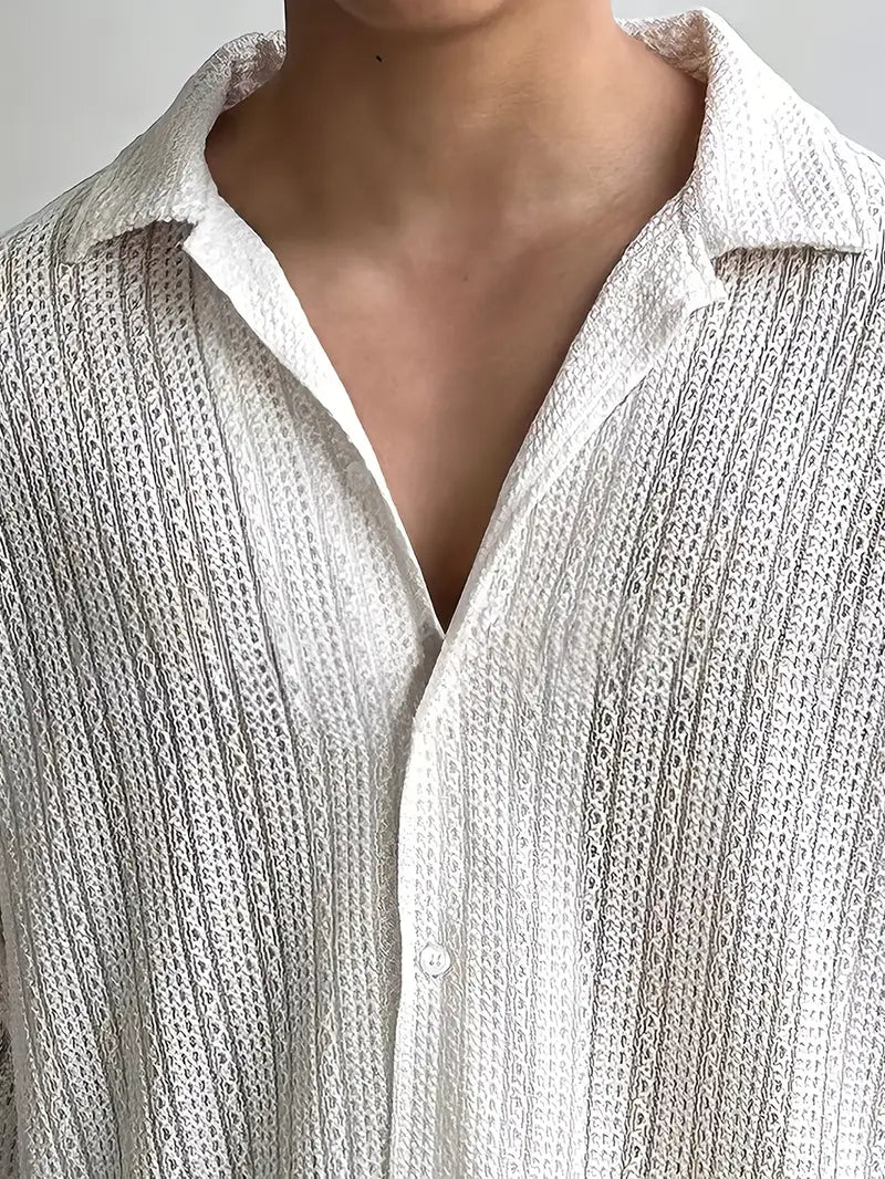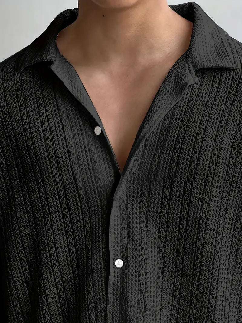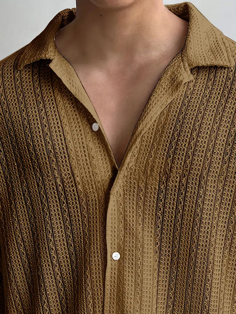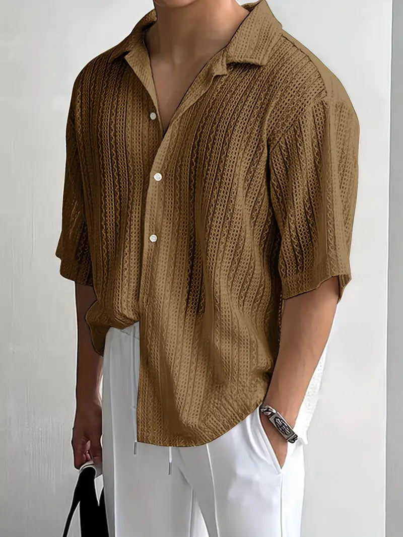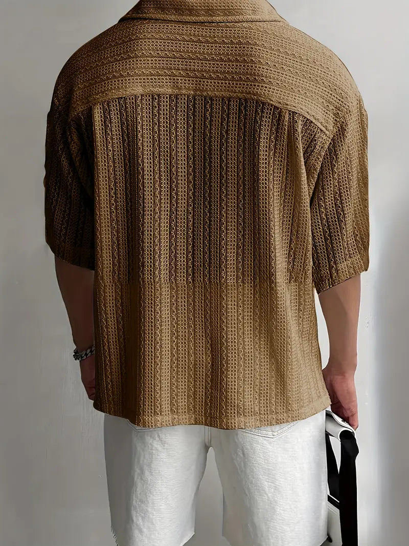 This men's button-up short sleeve shirt features a stylish cut-out jacquard weave, collared lapel, and half-body pocket. Made from lightweight polyester, it's perfect for casual summer wear. The loose fit and non-stretch fabric make it an ideal choice for modern casual attire. The material is 100% polyester and can be machine washed or professionally dry cleaned. With a solid color design and lapel collar, it's suitable for all seasons and can be dressed up or down.